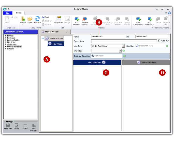 Process Designer is split into 3 panes—the Process pane, the Properties pane and the Pre-conditions pane.