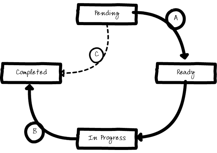 Between the Pending and Ready states there are optional pre-conditions as shown in (A). These conditions determine whether the process can transition to Ready. If a process has no pre-conditions, then it can transition directly to Ready. The process transitions (B) directly to Completed. Also, a process will go straight from Pending to Completed if an override condition is met (C) before its pre-conditions.