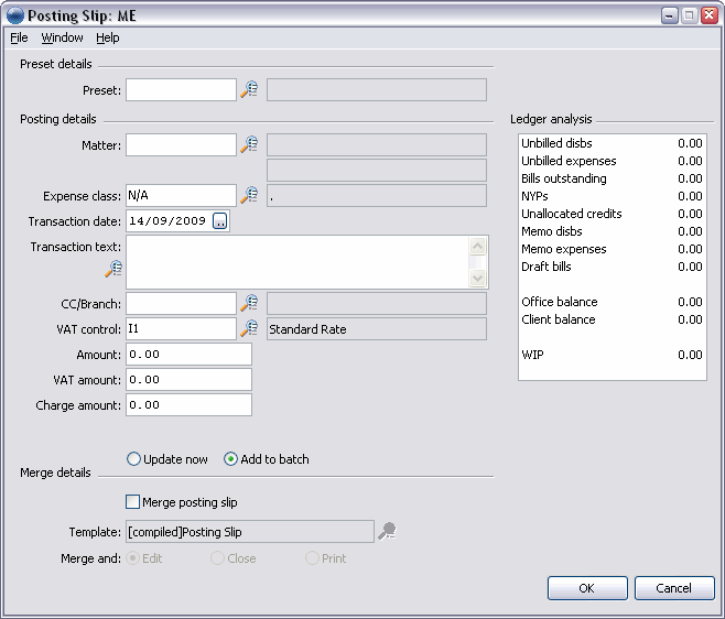 When using an ME, you must specify details of the expense. For a full list of posting slip fields, refer to the Posting Slip dialog box.